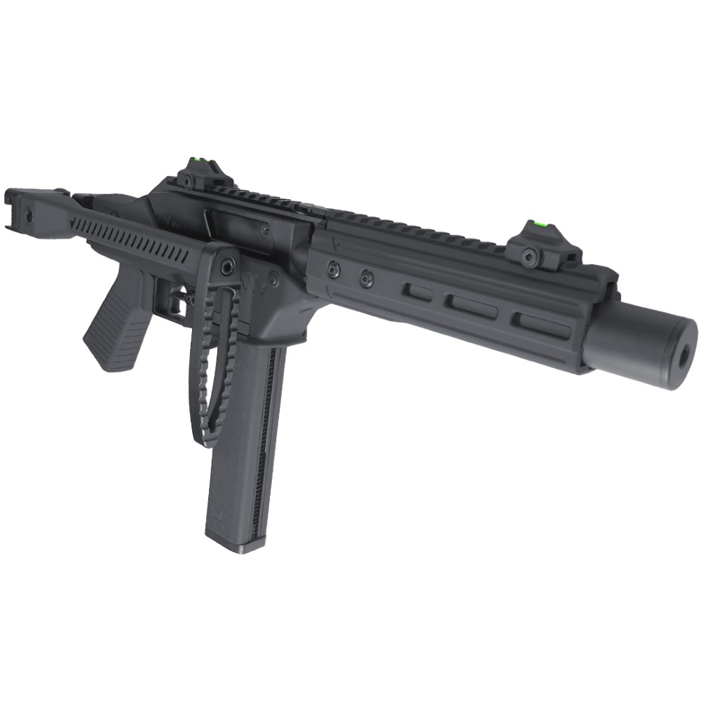 - Folding stock for compact storage and quick deployment.